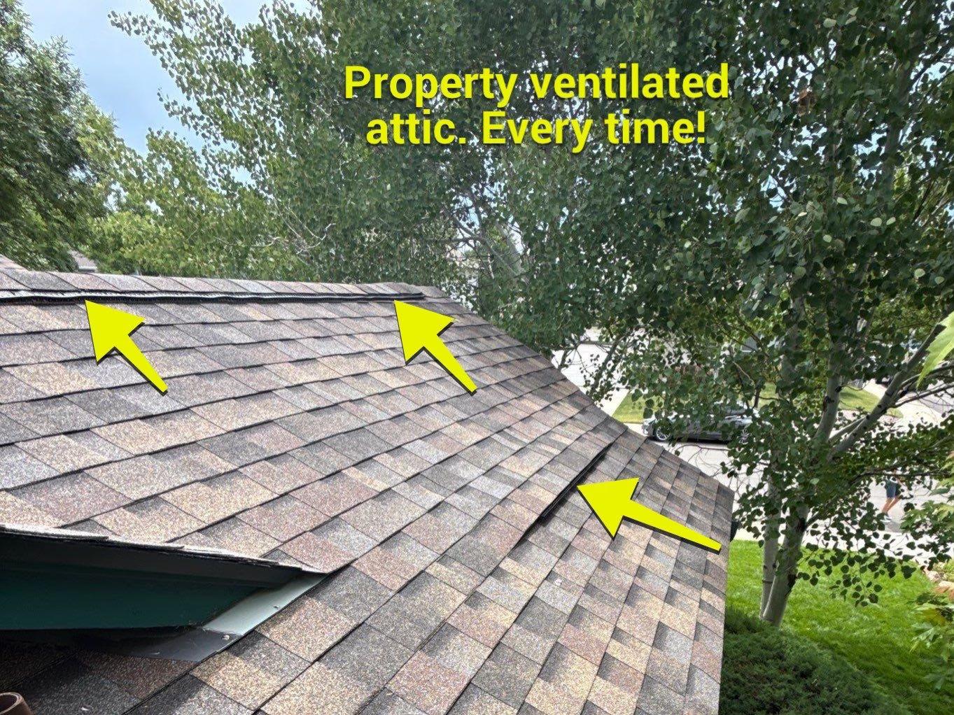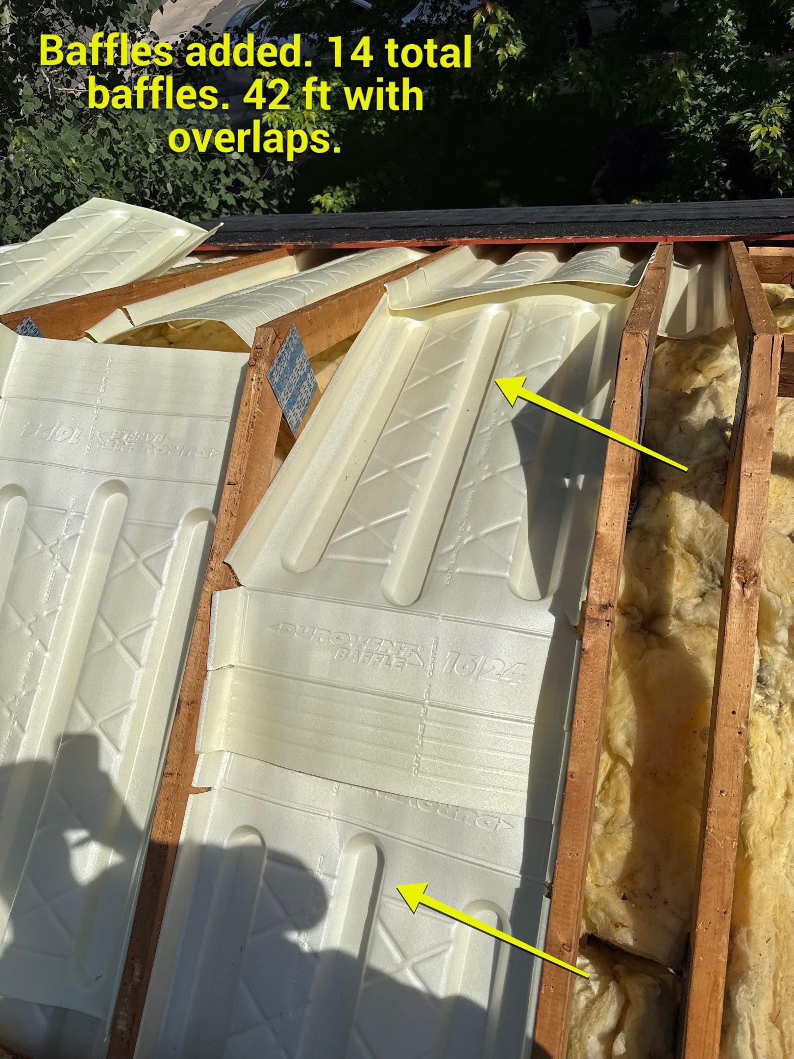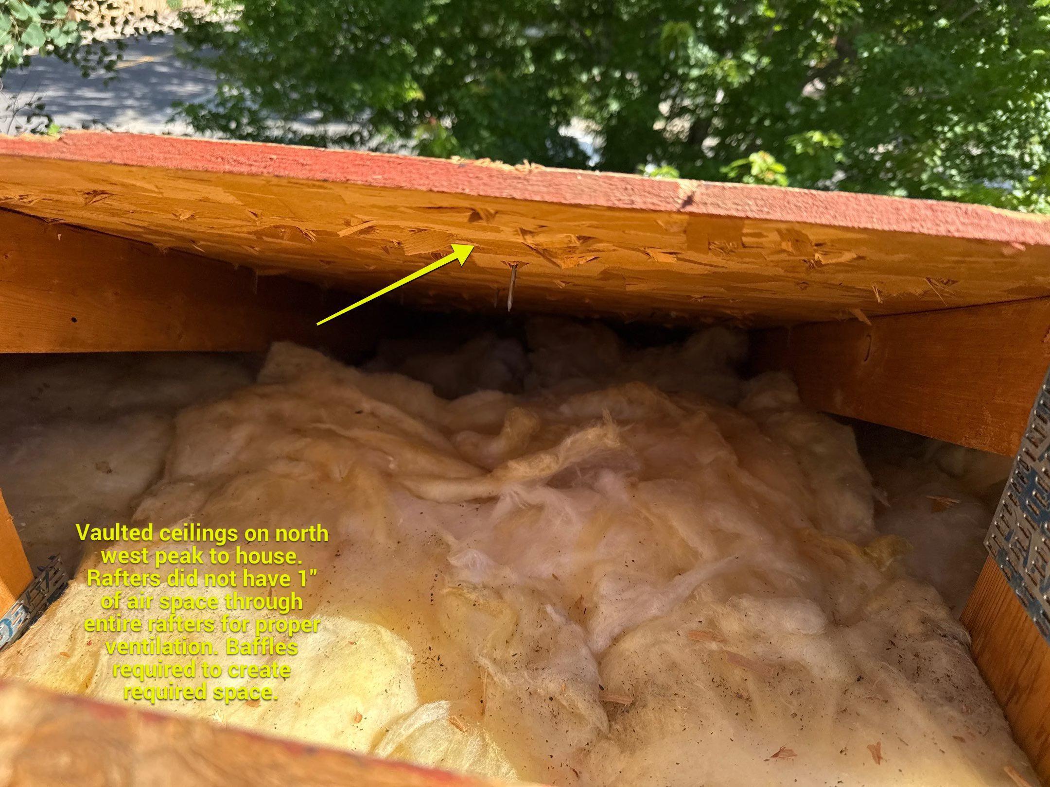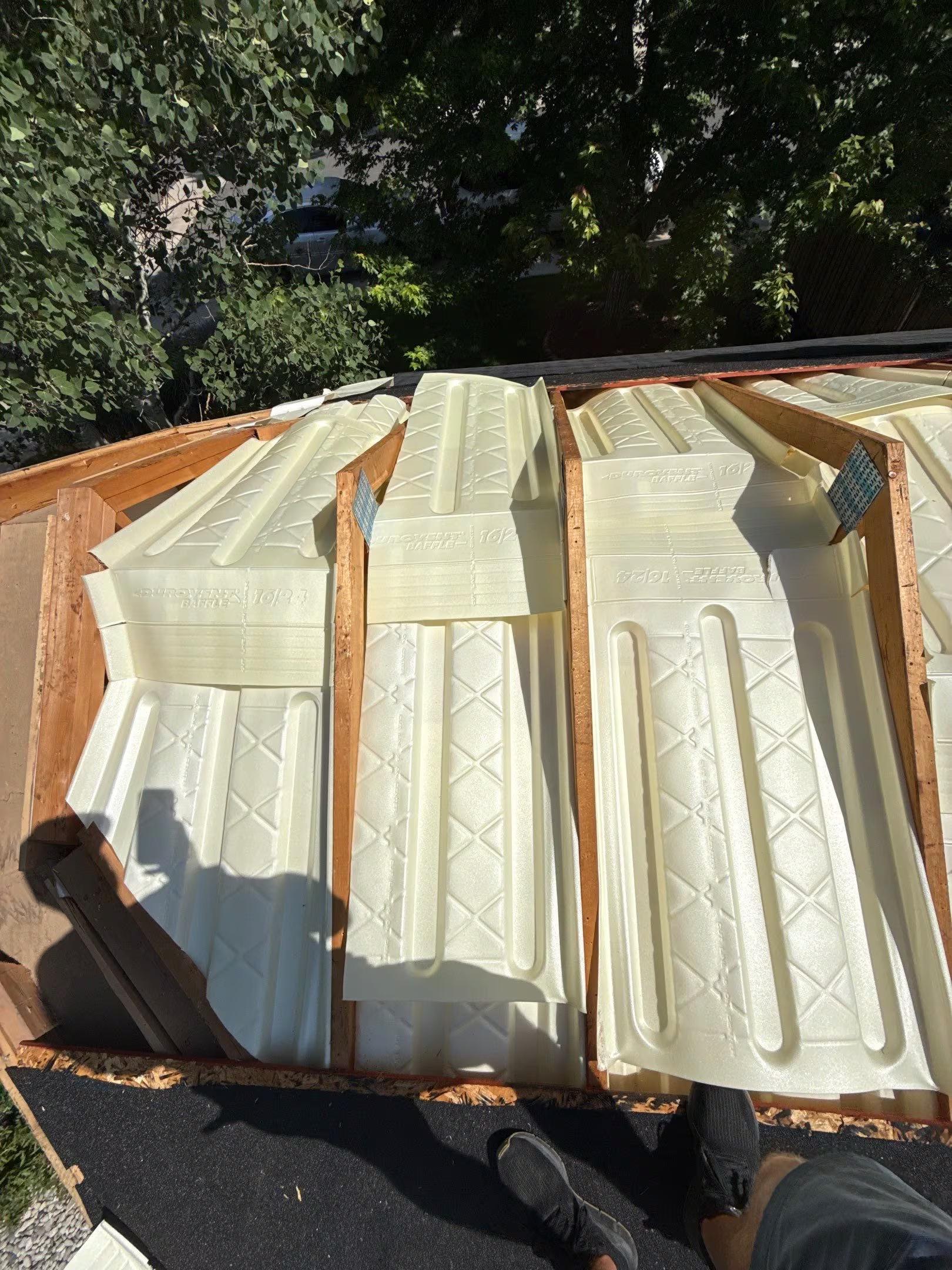 Ventilation scope: A complete ventilation redesign was required. Cathedral ceiling sections were identified where insulation was packed tightly against the roof deck. Portions of decking were removed to install baffles in each rafter bay, establishing a proper air channel. Intake and exhaust ventilation were redesigned to create a balanced airflow system across the entire roof assembly.
